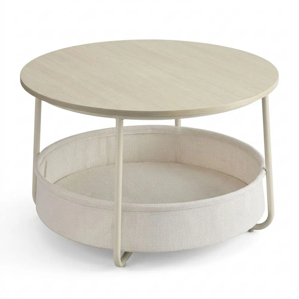 Runder Wohnzimmertisch mit Stauraum und Stoffkorb, Metallrahmen, beige-cremeweiß