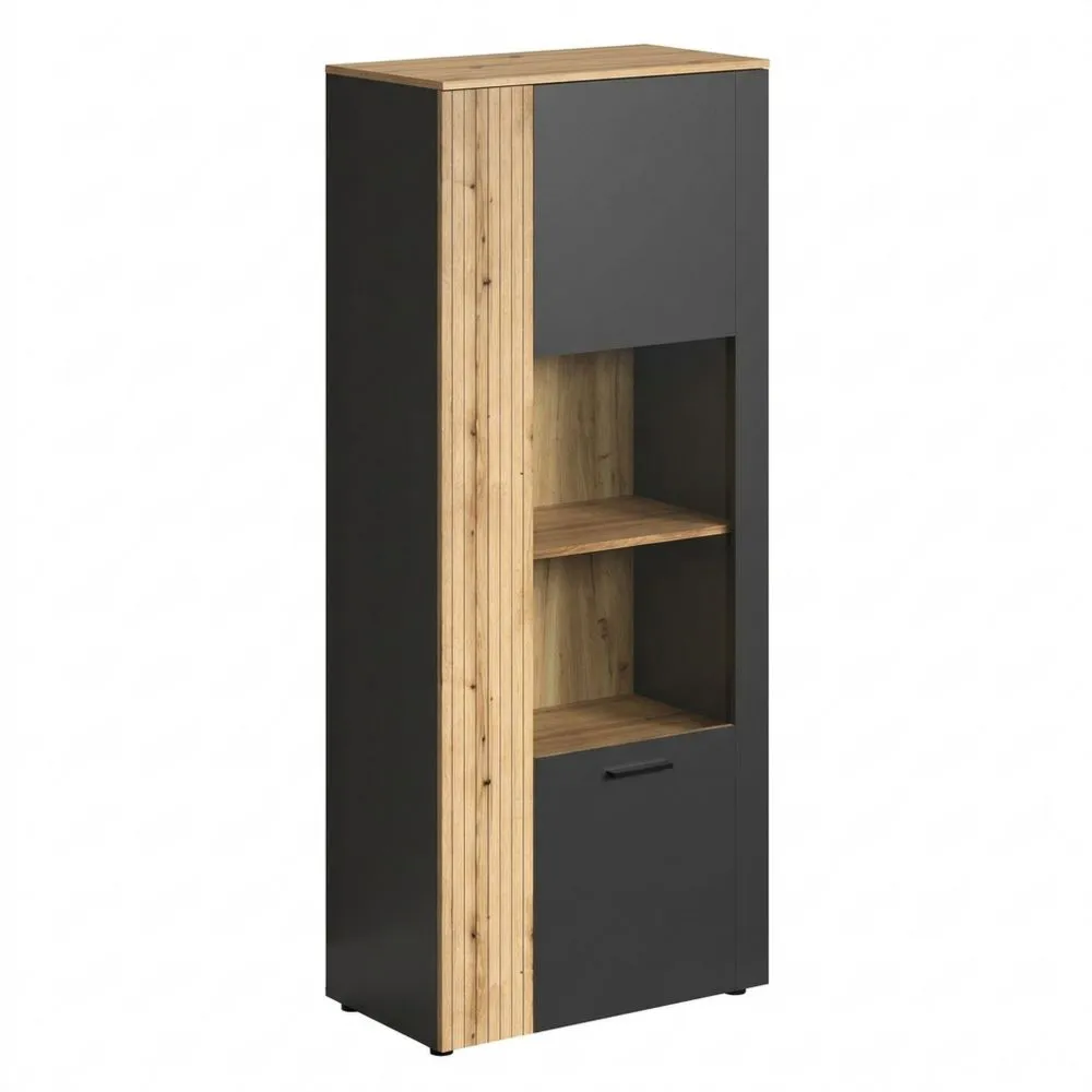 Zeitlose Standvitrine im modernen Look, die Funktionalität bietet. Der anthrazitfarbene Korpus kombiniert mit Rillenoptik in Eiche. Geeignet, um Objekte dekorativ zu präsentieren und gleichzeitig Ordnung zu halten. Die Vitrine mit den Maßen 80 x 195 x 42 cm bietet Nutzfläche bei schlankem Grundriss und integriert sich in Wohn- oder Essbereiche. Mit 2 Türen und 6 Fächern sowie 3 Einlegeböden für Dekoration, Sammlerstücke oder Geschirr. Der Türanschlag ist variabel links oder rechts montierbar. Gefertigt aus Holzwerkstoff mit Glaselementen bietet sie Stabilität und pflegeleichte Oberflächen. Zerlegt geliefert, mit verständlicher Aufbauanleitung einfach zu montieren.