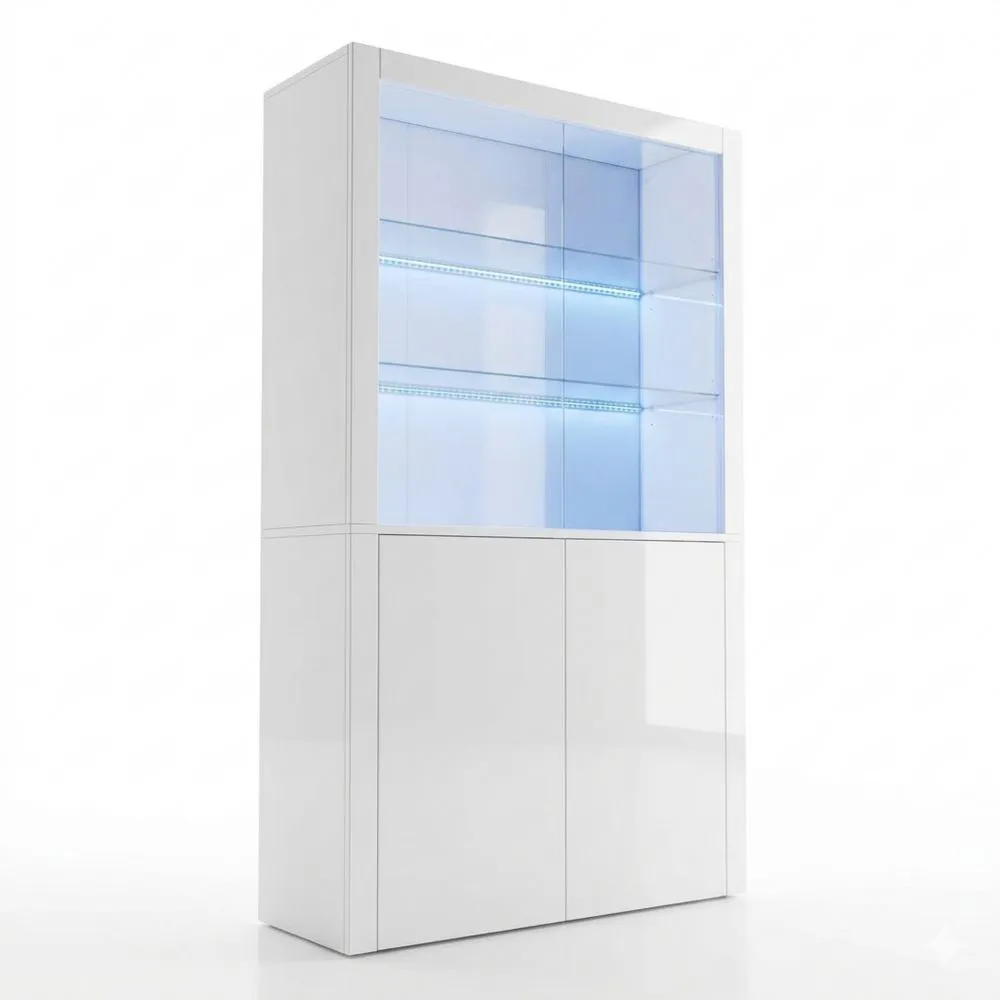 Die Vitrine mit den Maßen 100 x 35 x 170 cm präsentiert ein reinweißes Hochglanz-Design, passend für verschiedene Wohnstile wie modern, nordisch oder japanisch. Die integrierte LED-Beleuchtung bietet 16 Farben und 4 Effekte, steuerbar über eine App. Diese Vitrine bietet doppelschichtigen Stauraum mit einem Doppeltürschrank für die geordnete Aufbewahrung von Haushaltsgegenständen und Kleidungsstücken. Die hochwertige Konstruktion aus MDF-Material und gehärtetem Glas bietet Schlagfestigkeit und Transparenz. Die Vitrine ist mit Anti-Rückspulgurten ausgestattet, um ein Umkippen zu vermeiden. Sie vereint die Funktionen von Anzeige, Beleuchtung und Stauraum in einem Möbelstück.