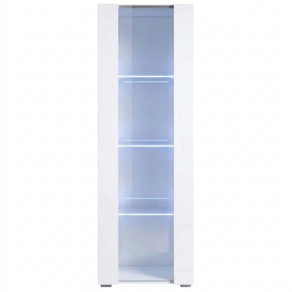 Vitrine mit Füßen und Flügeltür, ausgestattet mit vier Fächern zur Auslage von Gegenständen. Größe: Breite 40 cm x Höhe 167 cm x Tiefe 29 cm. Innenmaße der Fächer: Breite 36,8 cm x Höhe 39,8 cm x Tiefe 25 cm. Material: Vorderseite und Struktur aus Melamin. Drei Glasböden, vorbereitet für die Installation von LED-Leuchten. Vorderseite aus Methacrylat. Push-Click-Öffnungssystem. Oberflächen: Matte Farbtöne können kleine Kratzer kaschieren. Glänzende Flächen verstärken die Beleuchtung. Pflegehinweise: Reinigung mit feuchtem Tuch empfohlen, um Staub zu reduzieren und Oberflächen zu schonen.