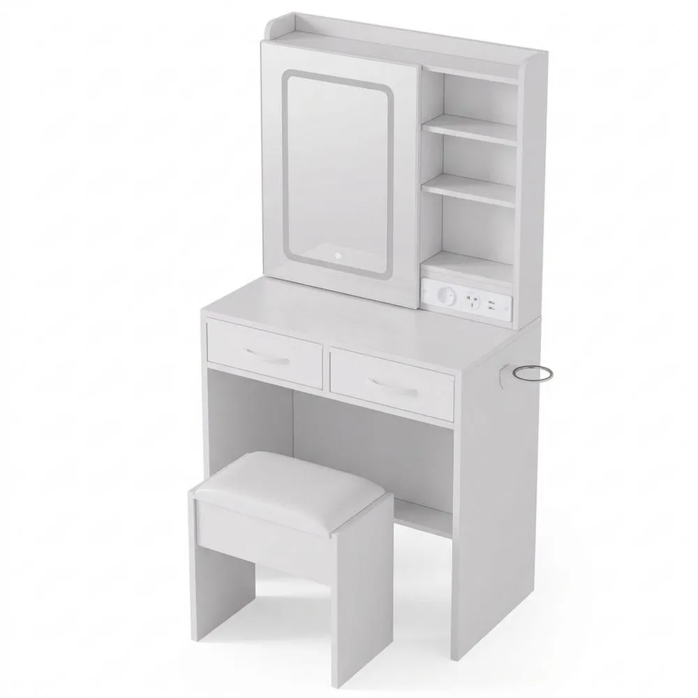 LED-Schminktisch mit Spiegel in 3 Farbmodi: kaltweiß, warmweiß und warmgelb. Er verfügt über eine Touch-Bedienung. Integrierte Ladestation mit 2 Steckdosen und 2 USB-Anschlüssen ermöglicht das gleichzeitige Laden von Geräten. Enthält einen Haartrocknerhalter. Stauraum durch zwei Schubladen, offene Ablagen und einen Untertisch-Bereich für Kosmetik und Schmuck. Hocker mit gepolstertem Sitz und Fach für Styling-Tools. Platzsparend verstaubar. Design mit pflegeleichter Glasplatte und in verschiedenen Farben. Geeignet für Schlafzimmer oder Ankleidezimmer.