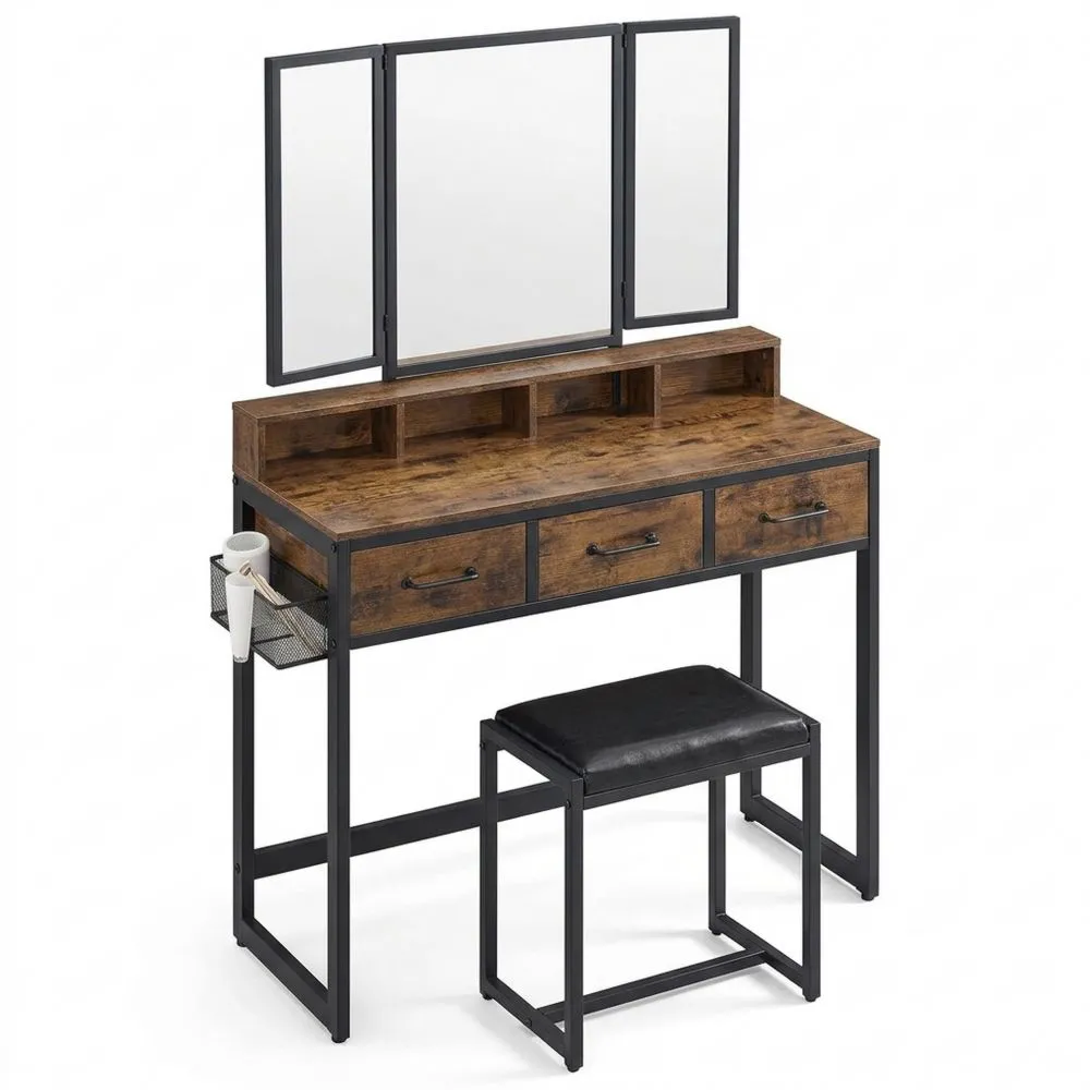 Der dreifachgefaltete Spiegel ermöglicht es, Make-up und Haare aus jedem Winkel zu betrachten. Der Schminktisch besteht aus stabilem Stahlrahmen und Holzspanplatte, was eine solide Basis für Ihre Produkte bildet.