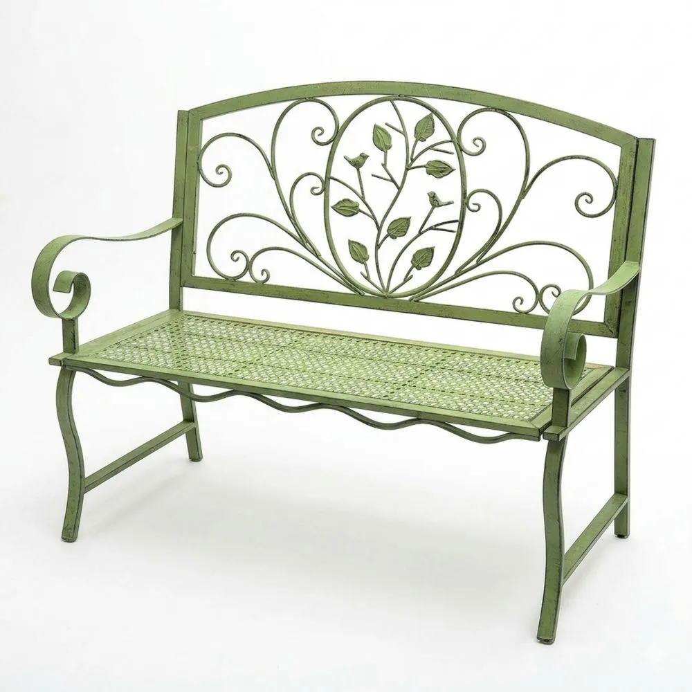 Metall-Gartenbank mit feinem Rankenmuster und Verzierungen im Rückenbereich. Geeignet für Garten, Balkon oder Terrasse.
