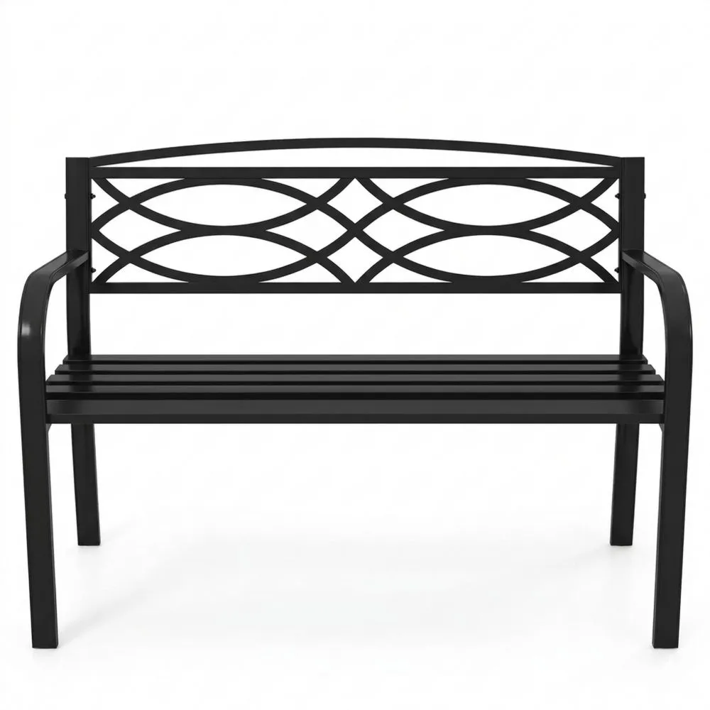 Die Gartenbank aus Metall bietet Stabilität durch gut verarbeitete Metallrohre. Sie besitzt rutschfeste Füße für einen sicheren Stand. Der Sitzbereich mit 107 cm Länge bietet Platz für zwei Personen und unterstützt bis zu 300 kg. Der geformte Sitz und die Armlehnen sind für einen angenehmen Aufenthalt im Freien konzipiert. Das Latten-Design sorgt für Belüftung und die Muster auf der Rückenlehne verleihen der Bank ein ansprechendes Aussehen in verschiedenen Außenbereichen. Geeignet für Garten, Terrasse oder Pool bietet die Bank eine funktionale und langlebige Sitzgelegenheit. Gesamtabmessungen: 116 x 49 x 83 cm (L x B x H).